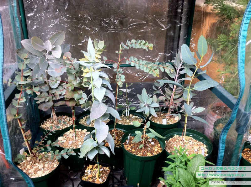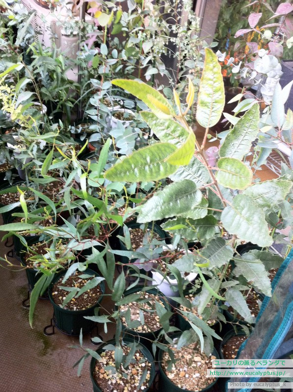 左手前がとても珍しいユーカリpruinosaです。